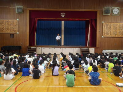 今日は久しぶりに全校朝会を行いました。すべてのクラスが時間通りに整列し、落ち着いた雰囲気で始めることができました。朝会では、夏休み中にラジオ体操に皆勤で参加した児童や、自由研究で優秀な成果を収めた児童の表彰がありました。