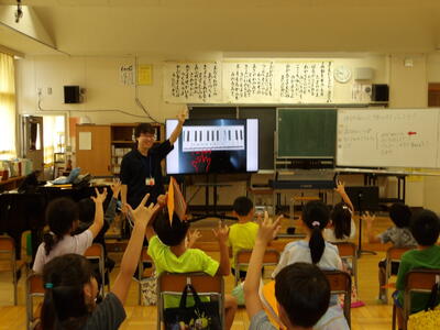 2年生の音楽では、「聖者の行進」の鍵盤練習に取り組みました。はじめに、手の指の番号で歌ったり、階名で歌ったりしながら曲に親しみ、その後はペアになって練習を行いました。友達と協力し合いながら練習する姿がとても印象的で、苦手な子も友達に教えてもらいながら一生懸命取り組むことができていました。学び合いを通して、子どもたちの音楽への意欲や優しさが感じられる授業となりました。