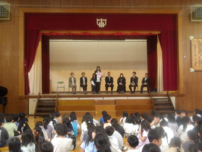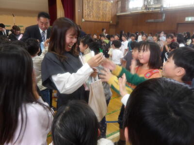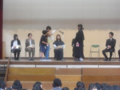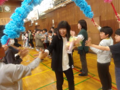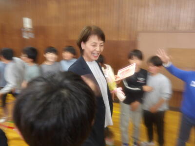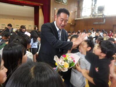 本日、離任式を行いました。これまでお世話になった先生方とのお別れの会です。代表児童からは、感謝の気持ちがたくさん詰まった心温まるお手紙と花束が贈られました。