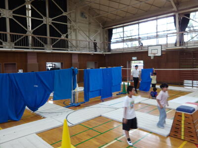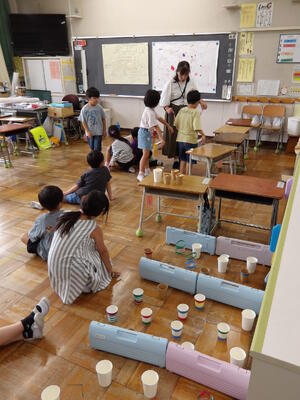 今回は、1学期にも実施した内容で、たてわり班の前半と後半に分かれて紅白玉を投げ合うゲームです。互いの陣地により多くの玉を投げ入れたチームが勝ちとなります。