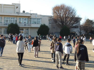 たてわり班ごとに分かれ、長縄跳びに取り組みました。