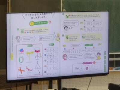 この授業では、二分音符・四分音符・八分音符の長さを、手拍子や体の動きを取り入れながらリズムで学習しました。初任者の先生は、子どもたちが音の長さを実感できるよう、分かりやすい声かけやテンポの工夫を重ねながら授業を進めていました。