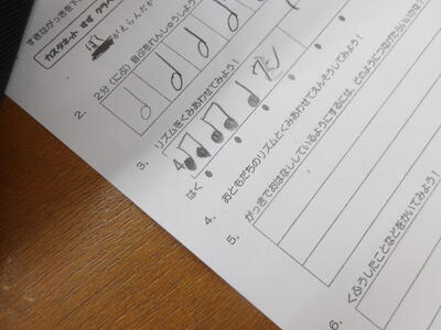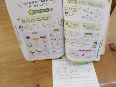 その後、タンバリンやトライアングル、小太鼓、カスタネットなどの楽器を使い、自分で考えた2小節のリズムを、ペアで交互に演奏しました。友達の演奏に耳を傾けながらタイミングを合わせようとする姿や、「もう一回やってみたい」「次はこの音にしよう」と笑顔で相談する様子が見られ、教室は音楽を楽しむ温かい雰囲気に包まれていました。