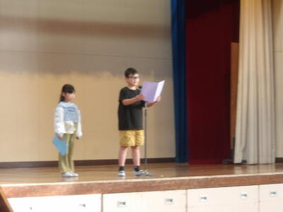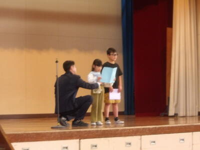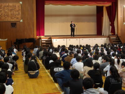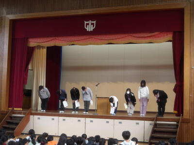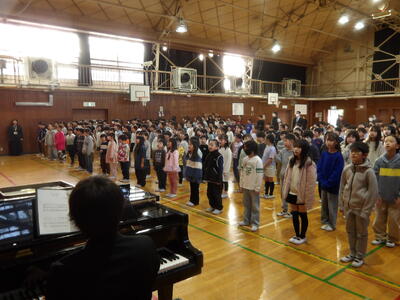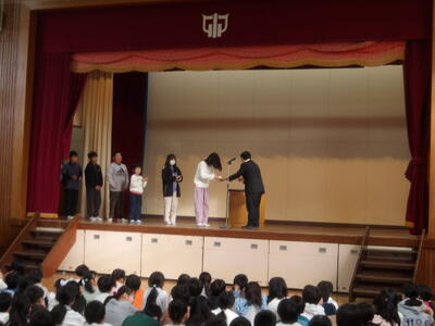 子どもたちは開始時刻よりも早く体育館に集まり、式が始まりました。体育館いっぱいに、元気のよい校歌が響き渡りました。式では、2年生による代表の言葉があり、2学期最後の表彰も行われました。