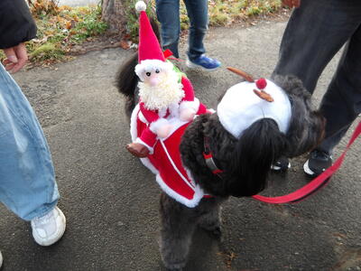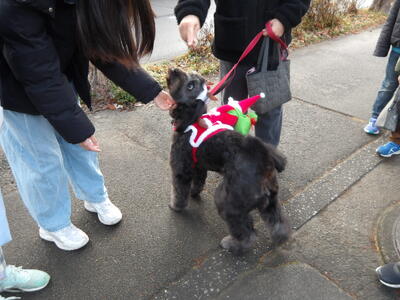 暑い夏から始まり、冷え込みの厳しい冬へと続いた長い2学期でしたが、保護者の皆様や地域の方々に見守られながら、子どもたちは毎日元気に登校することができました。いつも子どもたちを見守ってくれているワンちゃんも、今日は特別な服装で見送りに来てくれていました。