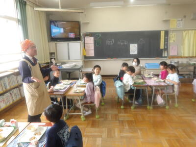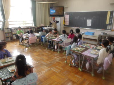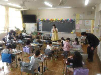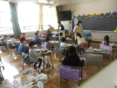 また、本日から1年生の給食もスタートしました。初めての給食当番や準備・片付けにも意欲的に取り組み、自分たちでできることを一生懸命に行っていました。これから少しずつ慣れながら、楽しく給食の時間を過ごしていけることと思います。