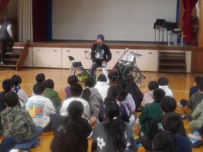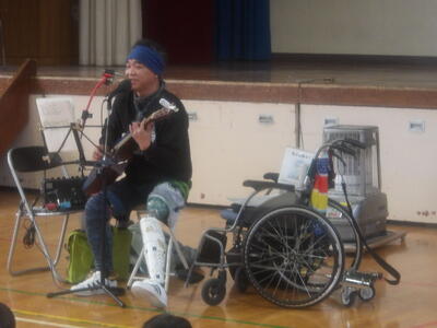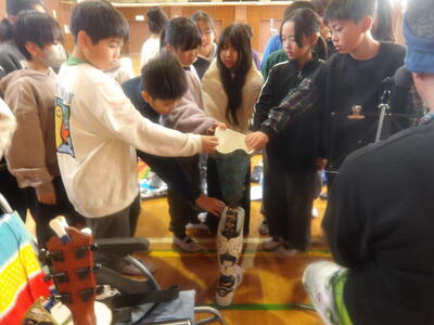 マイキーさんは、これまでのつらい経験や思いを子供たちに伝えてくれました。子供たちは、その思いや願いをしっかり受け止め、学習に取り組んでいました。また、マイキーさんから義足を実際に触らせてもらったり、マイキーさんの歌に感動してサインをもらったりもしていました。