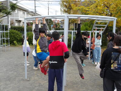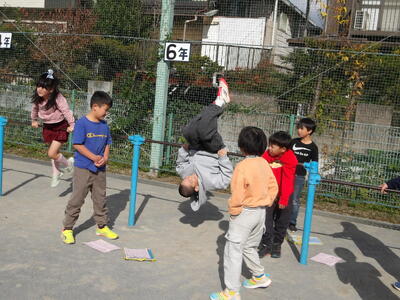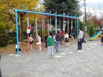 中休みには「チャレンジタイム」があり、たてわり班ごとに決められた場所で様々な運動に取り組みました。縄跳び・鉄棒・タイヤ跳び・うんてい・のぼり棒に加え、一輪車や竹馬など、子どもたちが自分のペースで楽しめる活動が揃っています。