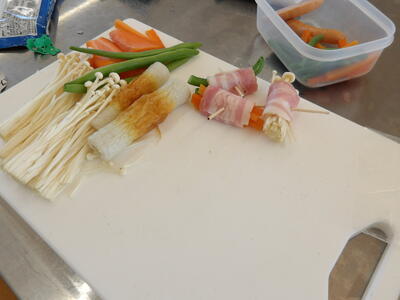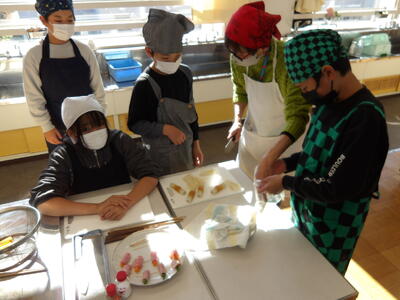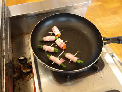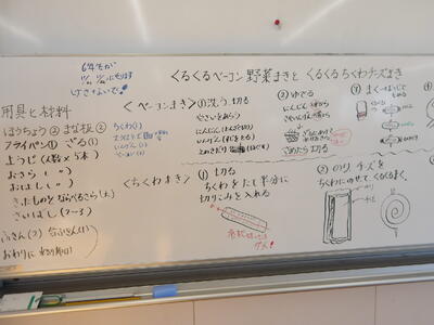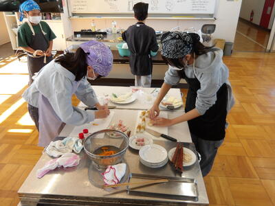 6年生は家庭科で調理実習を行い、「くるくる」をテーマに、ちくわやベーコンを使った巻き料理づくりに挑戦しました。グループで協力しながら楽しそうに仕上げる姿が見られました。