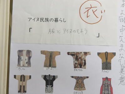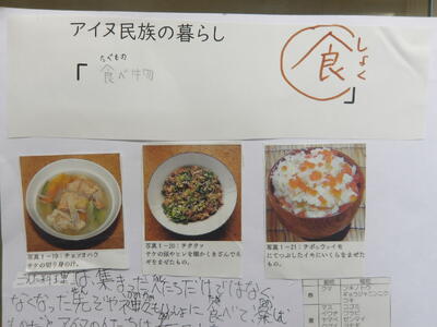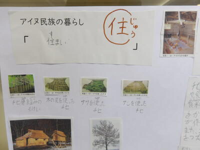 さらに、12月4日から始まる「人権週間」に向けて、保健・給食委員会の児童がアイヌの食事や衣服、住まいなどについて調べ、廊下にわかりやすく掲示をしてくれました。様々な文化を尊重する心を育む、素敵な学びとなっています。