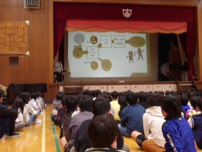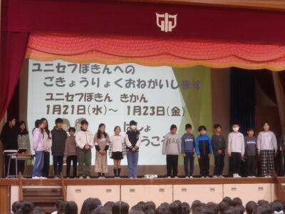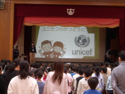 集会では、ユニセフとはどのような組織なのか、また皆さんから寄せられた募金が世界の子どもたちのためにどのように使われているのかについて、パワーポイントを活用しながら分かりやすく説明してくれました。子どもたちは真剣な表情で話を聞き、国際支援について考える貴重な時間となりました。