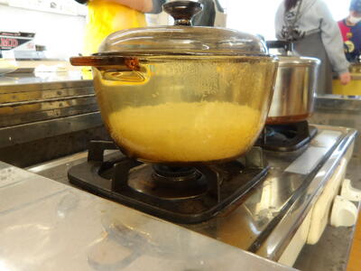 お米は、炊き上がりの様子がよく見えるパイレックス鍋を使い、中の変化を確かめながら丁寧に炊いていました。火加減や水分量に気を配りながら、協力して作業する姿が印象的でした。